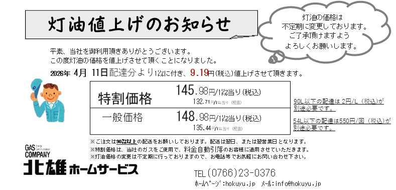 灯油価格値上げのお知らせ