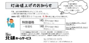 ●当社では、灯油の価格を週毎に変更する場合がございます。