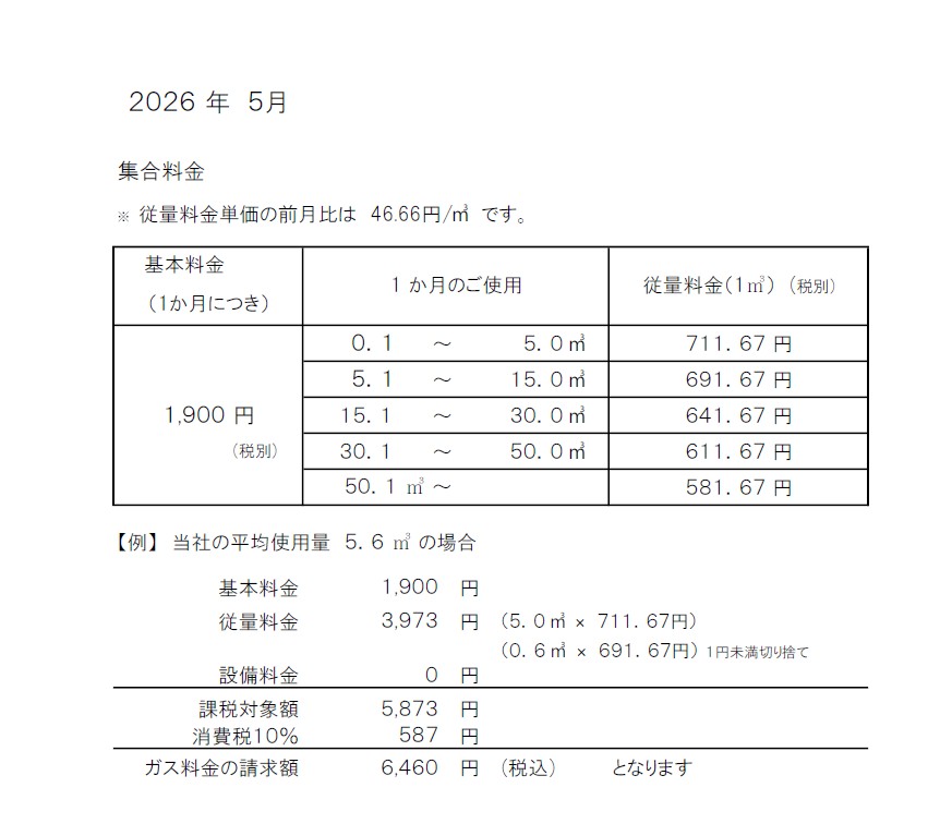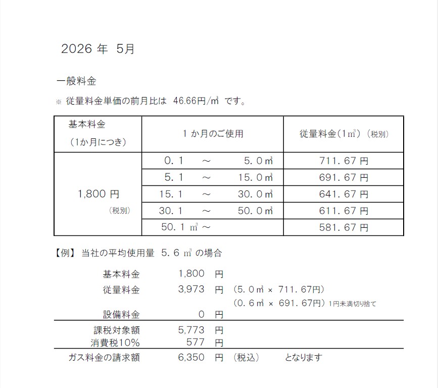 2026年5月ガス料金請求分が決まりましたので、お知らせいたします。